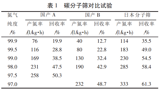 采用國內(nèi)兩個(gè)廠家及日本生產(chǎn)的碳分子篩進(jìn)行對(duì)比試驗(yàn),試驗(yàn)結(jié)果見表1。