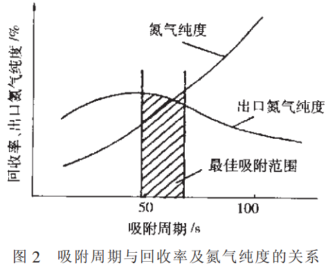 (3)從圖2可見,出口氮?dú)饧兌入S著吸附周期的增大而提高,當(dāng)達(dá)到峰后又開始緩慢下降;氮?dú)饣厥章孰S著吸附周期的加長而提高。為了兼顧氮?dú)饧兌扰c回收率,確定了一個(gè)吸附周期范圍。